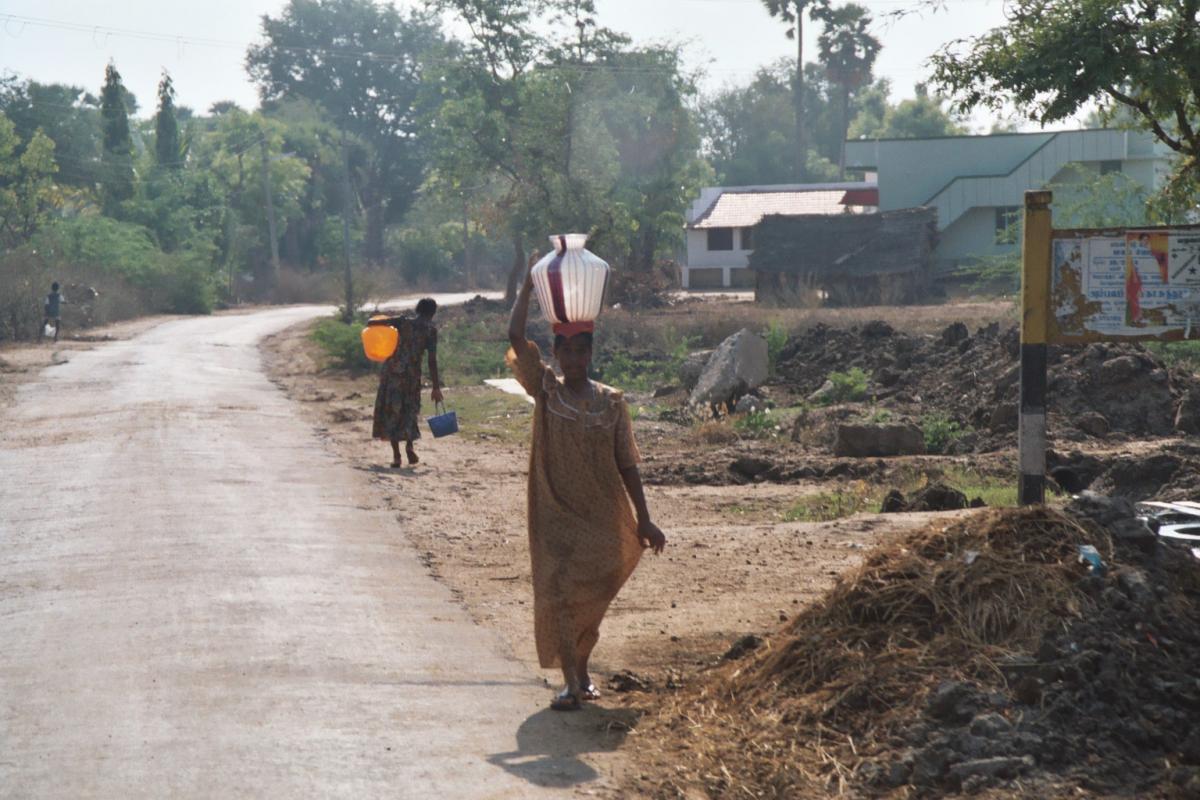 Lady carrying water jug from roadside water station. They trade out jugs when the go. Empty for full.